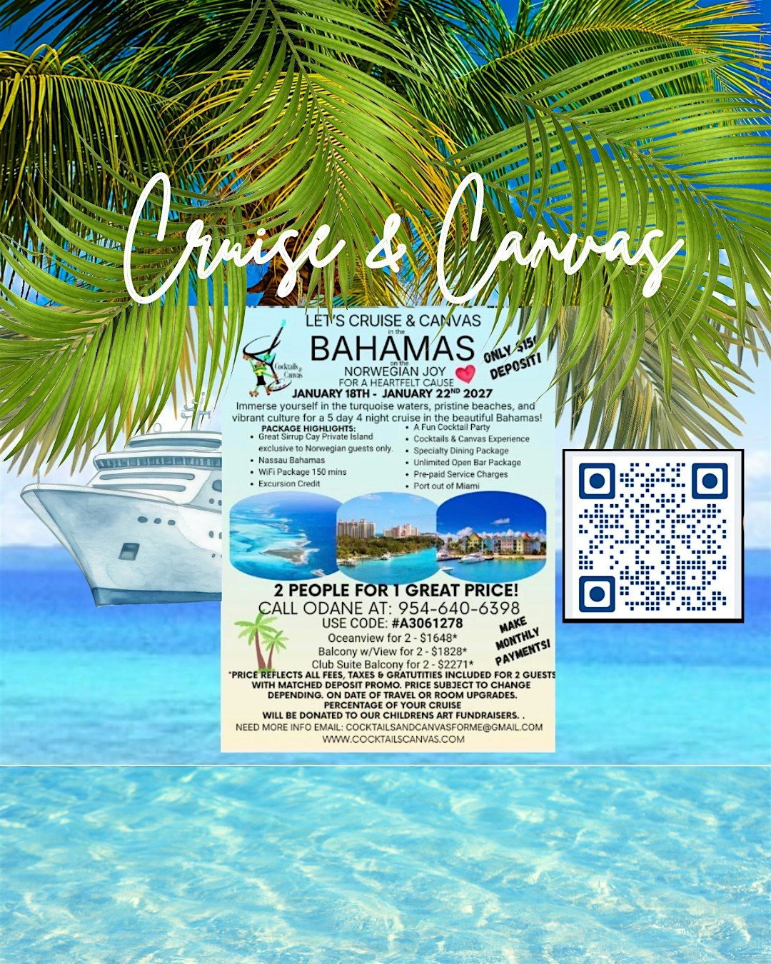 Note that the information is Free, Not the Cruise. There is a fee involved for booking this fun Cocktails & Canvas Exclusive Cruise & Canvas to the BAHAMAS!