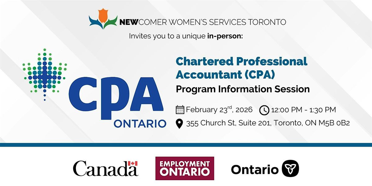 Newcomer Women's Services Toronto invites you to attend an exceptional information session in collaboration with the Chartered Professional Accountants of Ontario (CPA). This session is designed to unlock the door to professional and financial growth through the prestigious Chartered Professional Accountant (CPA) designation.