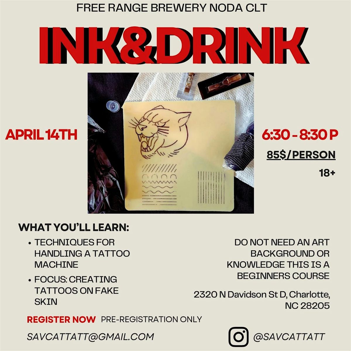 We're Back! Join us for another fun night at Free Range Brewery NoDa for a creative night of hands-on tattooing basics. This beginner-friendly workshop lead by Savannah (@savcattatt) will teach you how to handle a tattoo machine, practice essential techniques, and create your own artwork on fake skin to take home. Enjoy alcoholic and non-alcoholic drink options, great food, and a relaxed environment perfect for learning, laughing, and getting artsy. No experience needed, just come ready to have fun and try something new. All supplies provided.