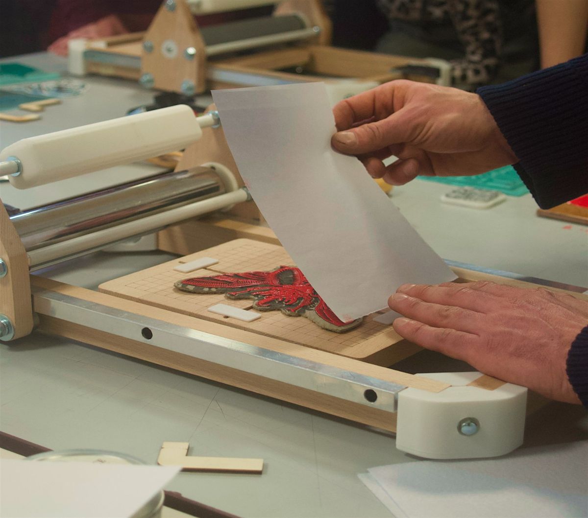 - Inchiostrazione e Stampa: Useremo i torchi del team (e quello del Fablab!) per trasferire l'inchiostro su carta da 200gr.