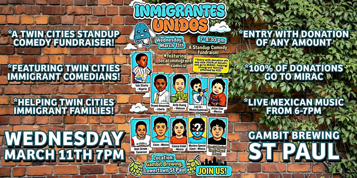 Join us for a fun night of standup comedy at Gambit Brewing in Lowertown St Paul while supporting local immigrant families! Featuring a full lineup of Twin Cities immigrant comics plus live pre-show Mexican music.