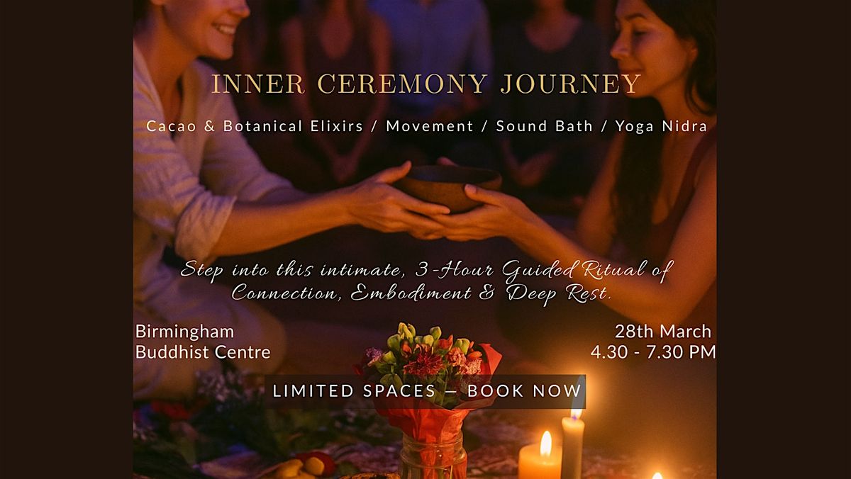 Inner Ceremony Journey is a gently guided, small-group evening in Moseley, where we move together through connection, embodiment, expression, healing, and deep rest.