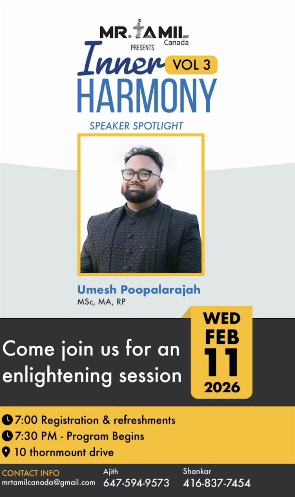 Come join us for an enlightening session featuring Umesh Poopalarajah (MSc, MA, RP).