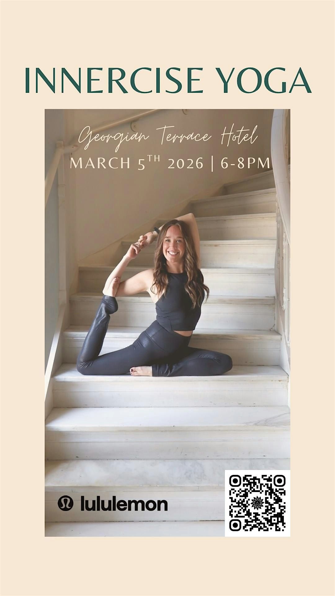 The Georgian Terrace is a modern luxury hotel with sophisticated decor, that is rich in history. Their outdoor terrace is a fabulous space to find tranquility in the middle of the city. Let's get spiritual and stretch with the option to stay and enjoy 1 complimentary cocktail or mocktail of choice after class. There are also two restaurants on site for dinner: Livingston and Edgar's Proof & Provision. Bring your own yoga mat and let's Innercise!