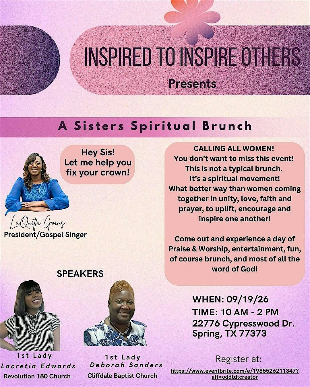 You don't want to miss this event! This is not a typical brunch. It's a spiritual movement. What better way than women coming together in faith, unity, love and prayer, to uplift, encourage and inspire one another!