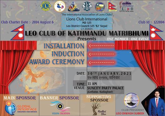 Warm Invitation for Leo Club of Kathmandu Matribhumi Proud event " Installation / Induction/ Award Ceremony" which is organized to appreciate the work done over the year. Event Detail: