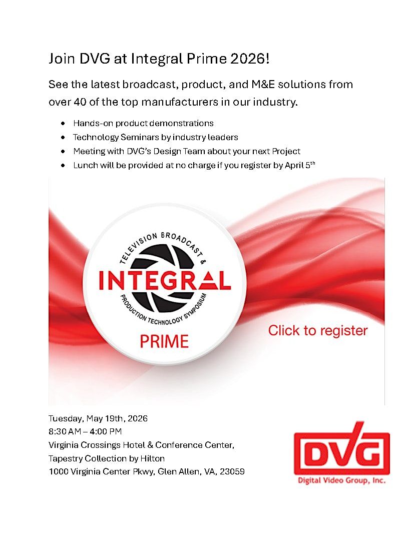 DVG will host the Integral Prime Symposium on Tuesday, May 19th, 2026! This event will include workshops, networking, and hands-on product demonstrations. See the latest broadcast and production solutions from over 40 of the top manufacturers in our industry! Seminars with guest speakers will cover topics ranging from 4K to video over IP.