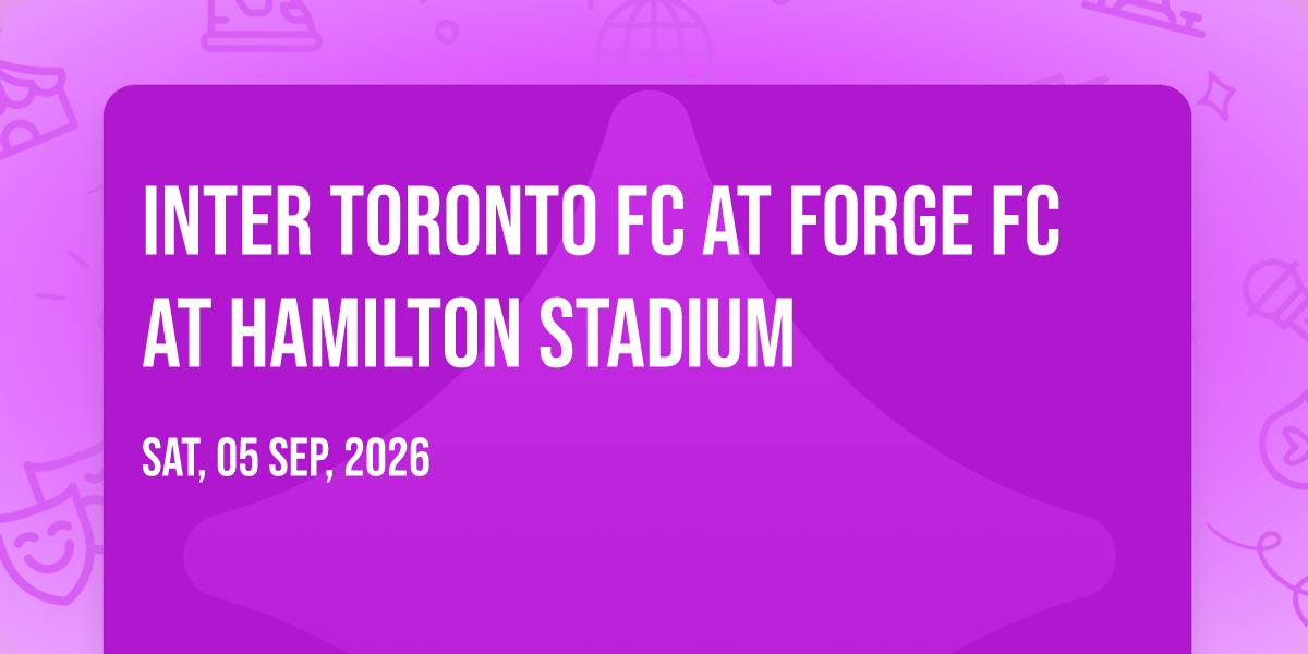 🎉 Welcome to Inter Toronto FC at Forge FC at Hamilton Stadium, where the impossible becomes possible and dreams take flight! 🏛️ Join us at Hamilton Stadium in the heart of Hamilton, ON for an event that will redefine your expectations. 📅 On October 12th, 2026 at 01:00 PM, witness the transformation of space and time into something truly magical. ✨ It's a curated experience combining the best of innovation, entertainment, and community spirit, creating moments that will be remembered for years to come. Whether you're a first-time visitor or a seasoned enthusiast, prepare to be amazed. 🎊 Book now to ensure your place in this unforgettable experience!