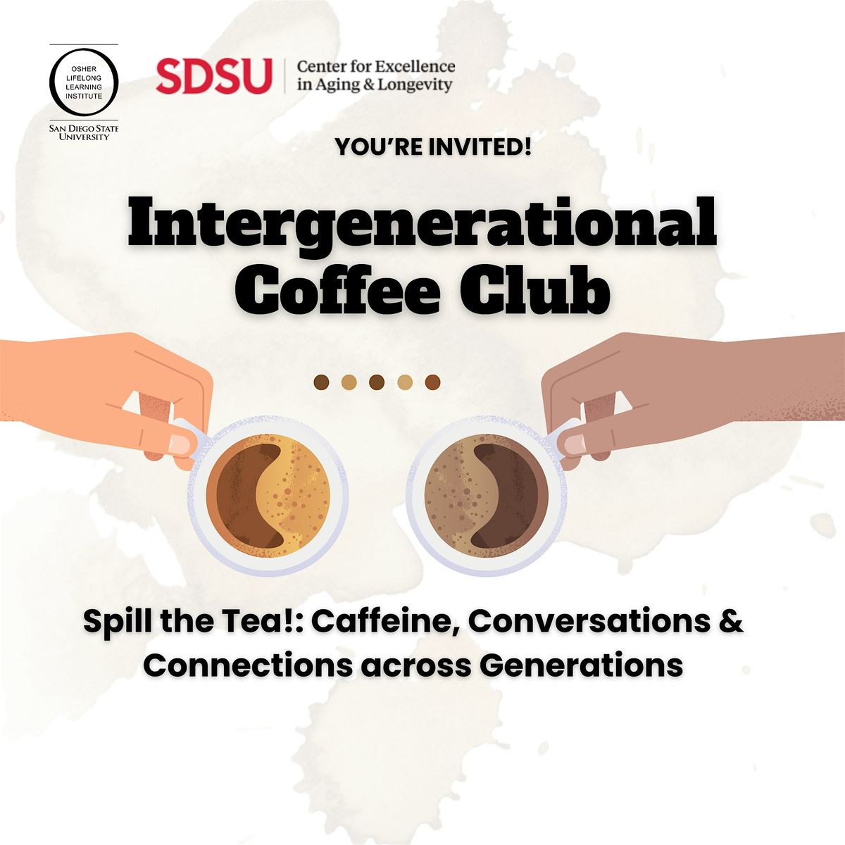 Join us for a relaxed and engaging intergenerational coffee meet-up hosted by SDSU Osher Lifelong Learning Institute and the SDSU Center for Excellence in Aging & Longevity. This gathering brings together lifelong learners, community members and students of all ages to share stories, build connections, and explore perspectives across generations over a cup of coffee.