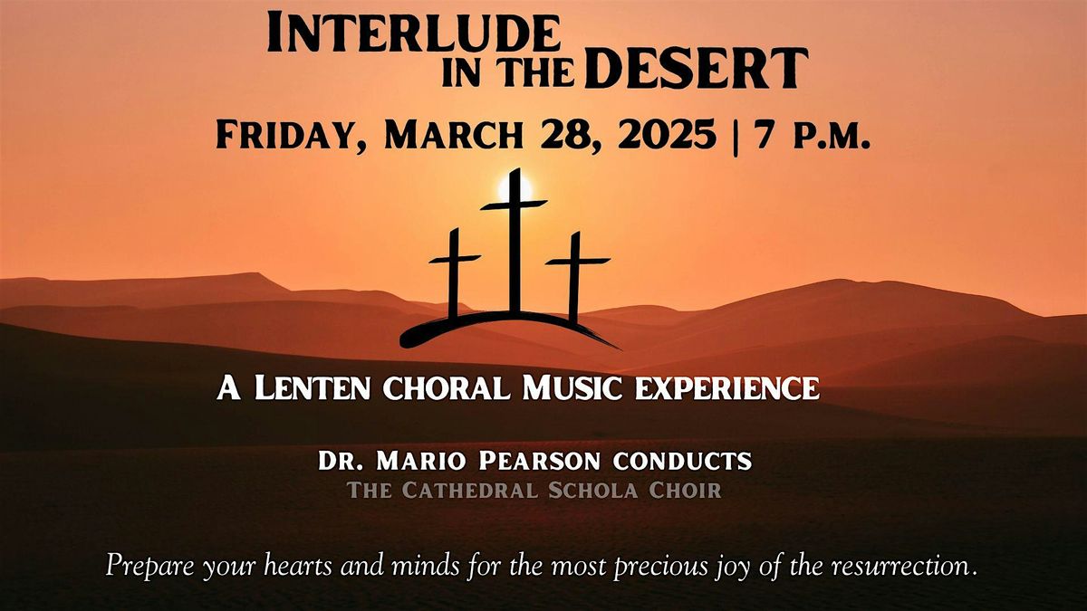 Join us under the gold dome for Interlude in the Desert- A Lenten Sacred Choral Music Concert on Friday, March 20, 2026, at 7:00 PM (Central Daylight Time). This event will occur downtown at the Cathedral of the Immaculate Conception, 416 West 12th Street (Entrance on 11th and Broadway), Kansas City, MO 64105.