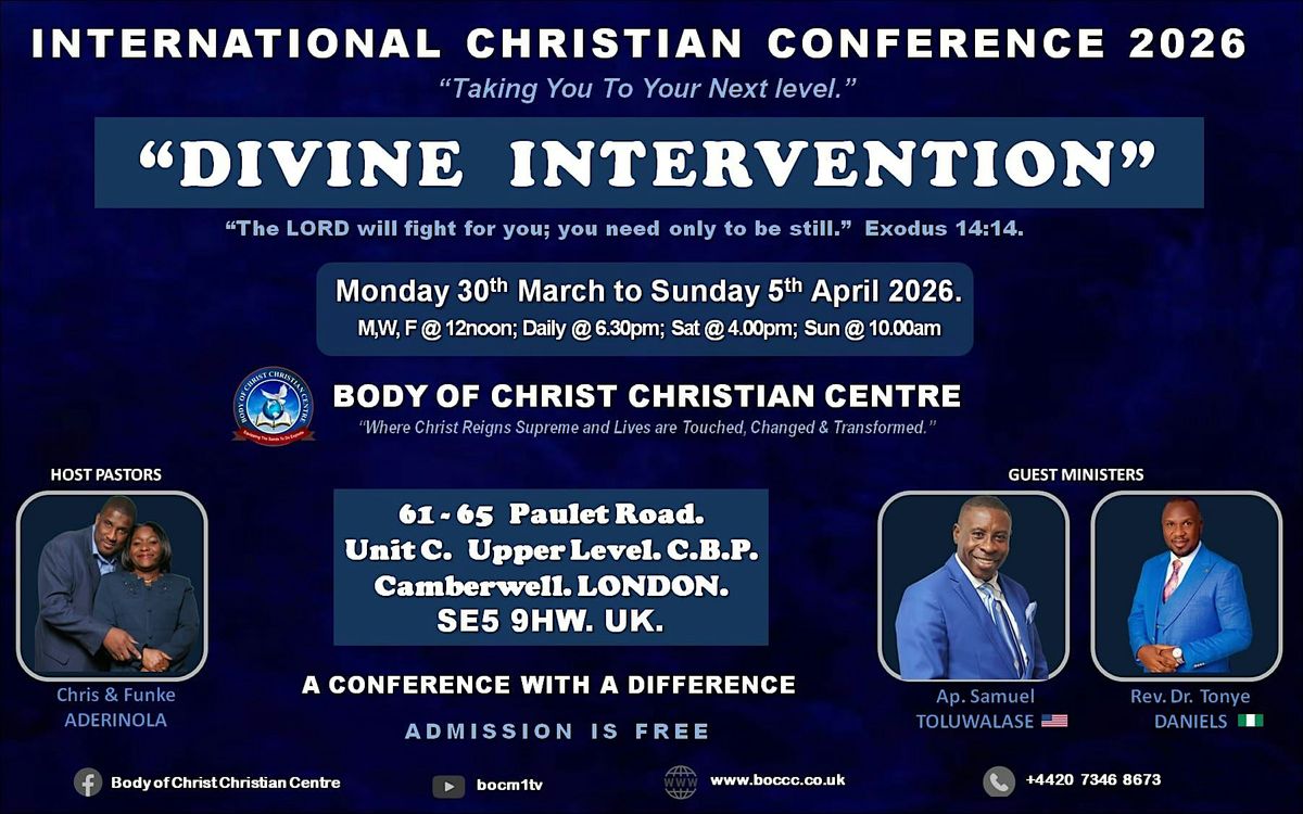 Hosted by Body of Christ Christian Centre Founders, Pastors Chris and Funke Aderinola, with Guest Ministers Apostle Samuel Toluwalase (USA), and Rev. Dr Tonye Daniels (Nigeria), lives will be touched, changed and transformed.