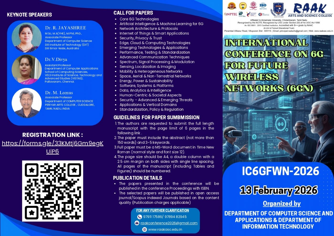 The International Conference on 6G for Future Wireless Networks (6GN) is a premier international forum organized by the Department of Computer Science and Applications and the Department of Information Technology, RAAK Arts and Science College, Perambai, Tamil Nadu. The conference aims to bring together researchers, academicians, industry experts, innovators, and policymakers from across the globe to deliberate on the vision, enabling technologies, challenges, and future directions of sixth-generation (6G) wireless communication systems.