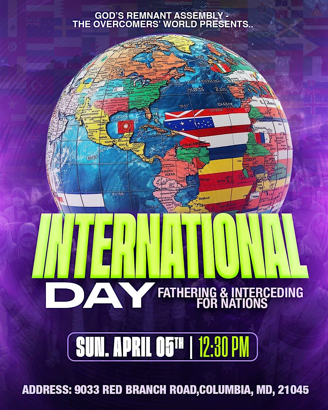 Join us at God's Remnant Assembly - Citadel of Miracles for a resurection Sunday, for a day of intercession, prayer, celebration, community, and empowerment themed "Fathering and Interceding the Nations." This event welcomes the rich tapestry of cultures from around the world as expressions of God's creation. Let's unite in prayer and revel in the diversity of nations. Don't miss this unique gathering!