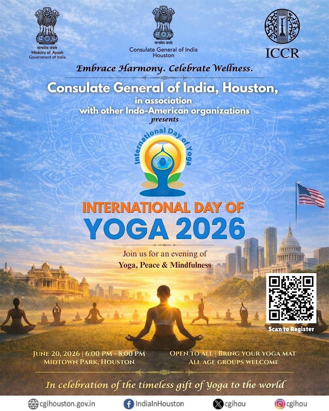 Join us at Midtown Park on June 20, 2026, at 6:00 PM (Central Time) to celebrate the International Day of Yoga.