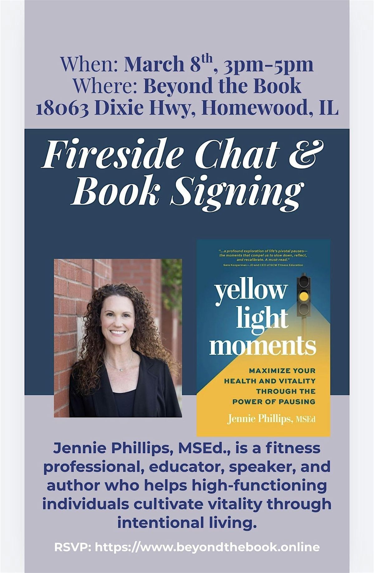 She is also the author of Yellow Light Moments: Maximize Your Health and Vitality Through the Power of Pausing and the creator of the Yellow Light Moments® Framework (Yield. Listen. Move.), a system designed to help individuals pause with purpose and take aligned action toward greater balance and well-being.