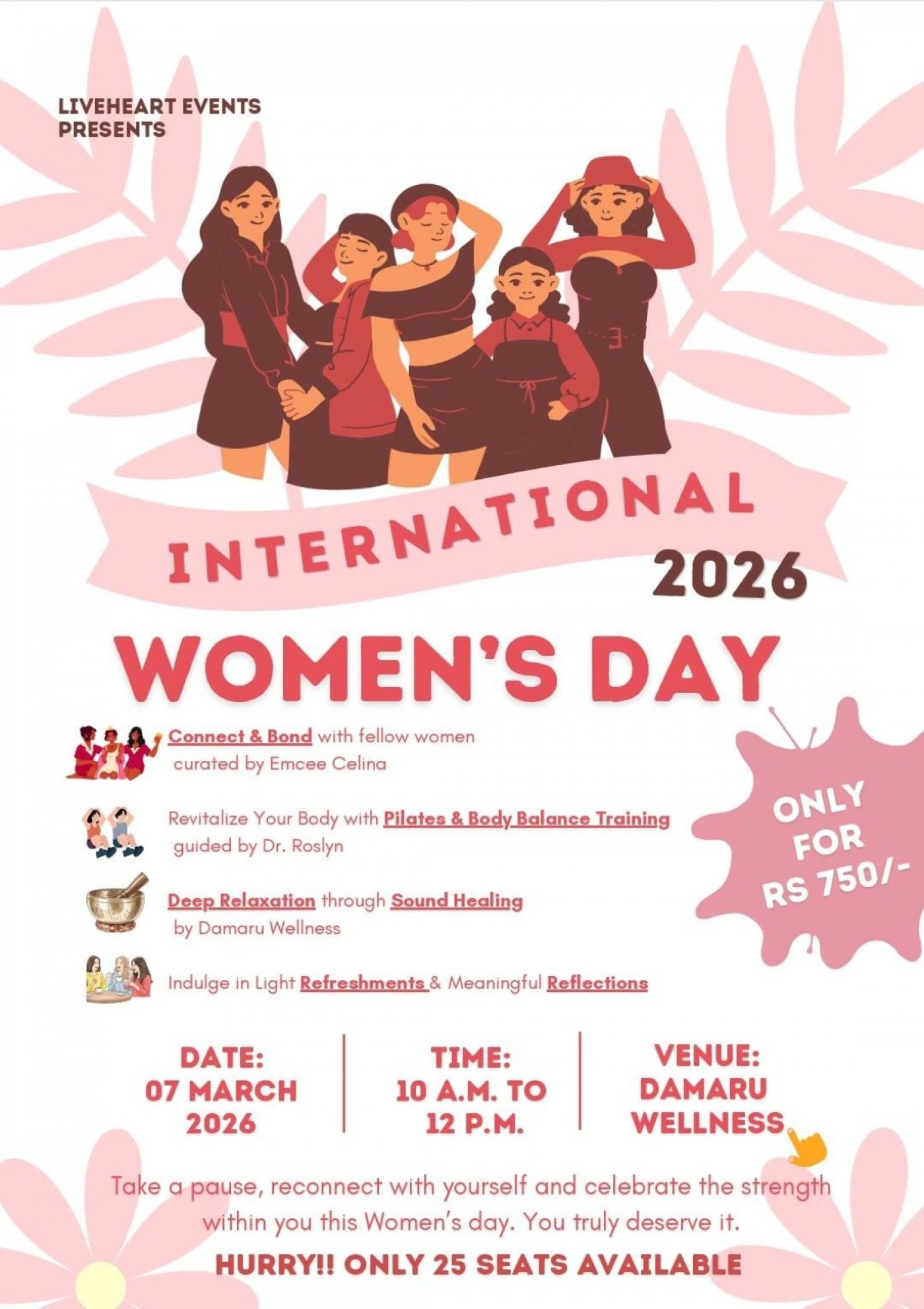 LiveHeart Events invites you to a thoughtfully curated wellness experience created for women who deserve a moment to pause, breathe, and reconnect with themselves and with a supportive community of like-minded women. In today’s fast-paced world, we often celebrate achievements but forget to nurture our inner balance. This event is designed to change that.