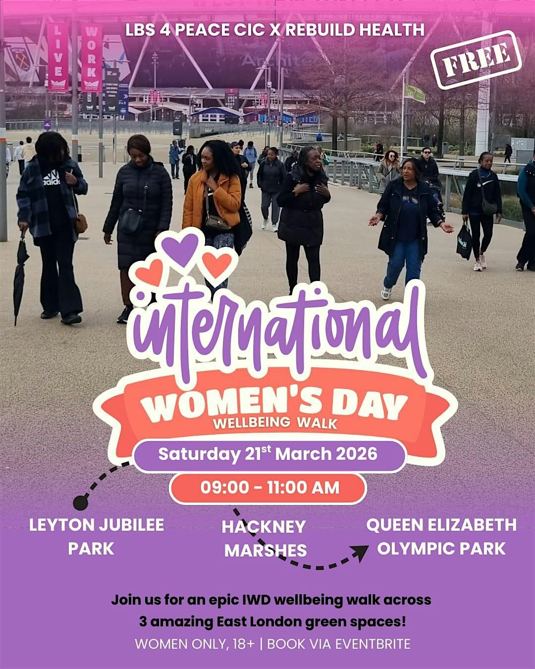 Celebrate International Women’s Day with a joyful, women-only wellbeing walk through some of East London’s most scenic green spaces. This uplifting walk is all about movement, connection, and taking time for yourself in a supportive and welcoming environment. Whether you come to meet new people, enjoy nature, or simply start your weekend feeling good, you are warmly invited!