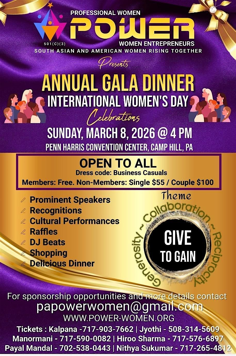 At POWER (Professional Women and Women Entrepreneurs), our mission is to empower and uplift South Asian and American women through the pillars of Information, Guidance, Recognition, Achievement, and Women’s Sports, fostering growth and opportunity in an inclusive and supportive environment. POWER actively addresses the pervasive issue of domestic violence by raising awareness, providing resources, collaborating with partners, and supporting intervention efforts to create safer communities. Through meaningful programs and community-driven initiatives—celebrated annually at the International Women’s Day and POWER Annual Gala—the organization uplifts women and amplifies their voices. POWER supports victims of domestic violence with access to crisis intervention, referrals, advocacy, and long-term empowerment while empowering immigrant and minority women through education, leadership development, and resource access. The Gala promotes mental, physical, and emotional well-being through wellness initiatives, educational programming, and community engagement. It also serves as a platform to recognize achievements and encourage women’s leadership, entrepreneurship, and civic participation. Through initiatives such as arts programs, free health screenings, education, and women’s sports, POWER strengthens communities by fostering equality, resilience, and social responsibility. POWER believes that when women thrive, families strengthen, communities flourish, and future generations succeed.
