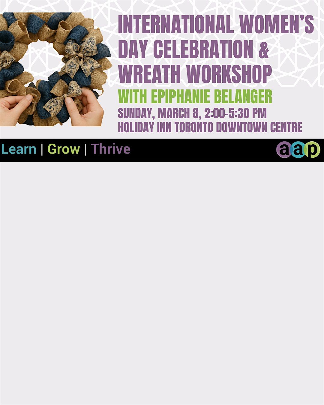 Join the AAP-TCB and hobbyhub to celebrate your creativity by making your own unique wreath using a variety of mesh, ribbons, and fun add-ins. You will be guided step-by-step by Epiphanie to create a masterpiece by YOU, for YOU. Cheers to celebrating you, today and everyday!
