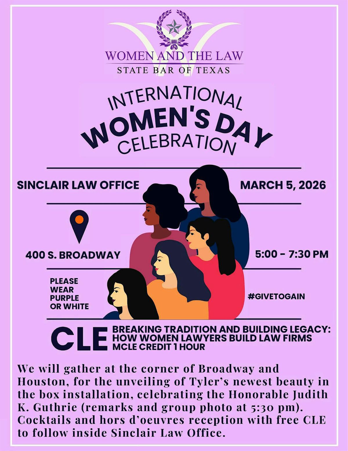 You do not need to be a member of Women and the Law Section, Smith County Bar Association or the Women's Section of the Smith County Bar Association to attend this event - all are welcome!