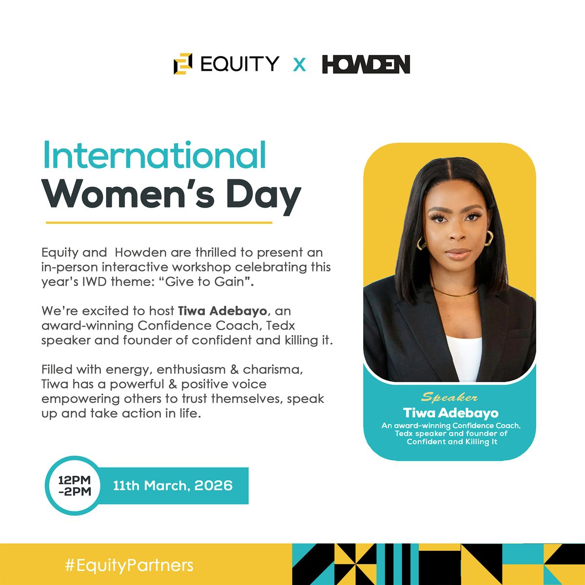 We are delighted to welcome Tiwa Adebayo, award-winning Confidence Coach, TEDx speaker and founder of Confident and Killing It, who will lead a powerful and practical session exploring how generosity, collaboration and visible confidence can accelerate career progression and gender equality.