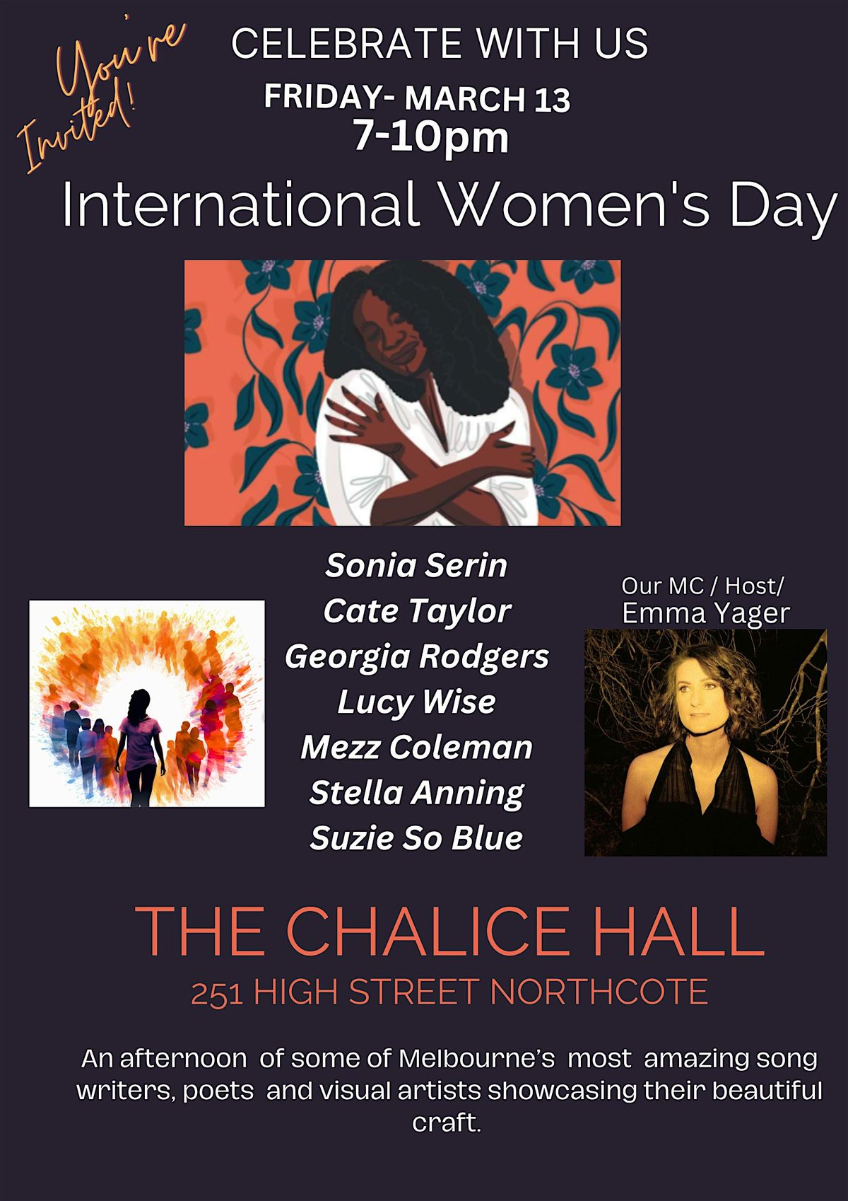 International Women’s Day 2026, celebrates the strength, creativity, and unity of women everywhere. This year’s event held in the beautiful ambience of the The Chalice Hall brings together extraordinary musicians and artists; through their performances and exhibits highlight not only women’s artistic brilliance but also the collective power of coming together for equality and progress. Music, Art, Community business leaders collaboration remind us that community thrives when creativity is shared and celebrated. Let this event be a call to support one another, strengthen our communities, and continue building a world where art and empowerment walk hand in hand. Among the list of these amazing humans, Suzie So Blue, Sonia Serin, Cate Taylor, Georgia Rodgers, Lucy Wise, Stella Anning, Mezz Coleman and our awesome host /DJ Emma Yager.
