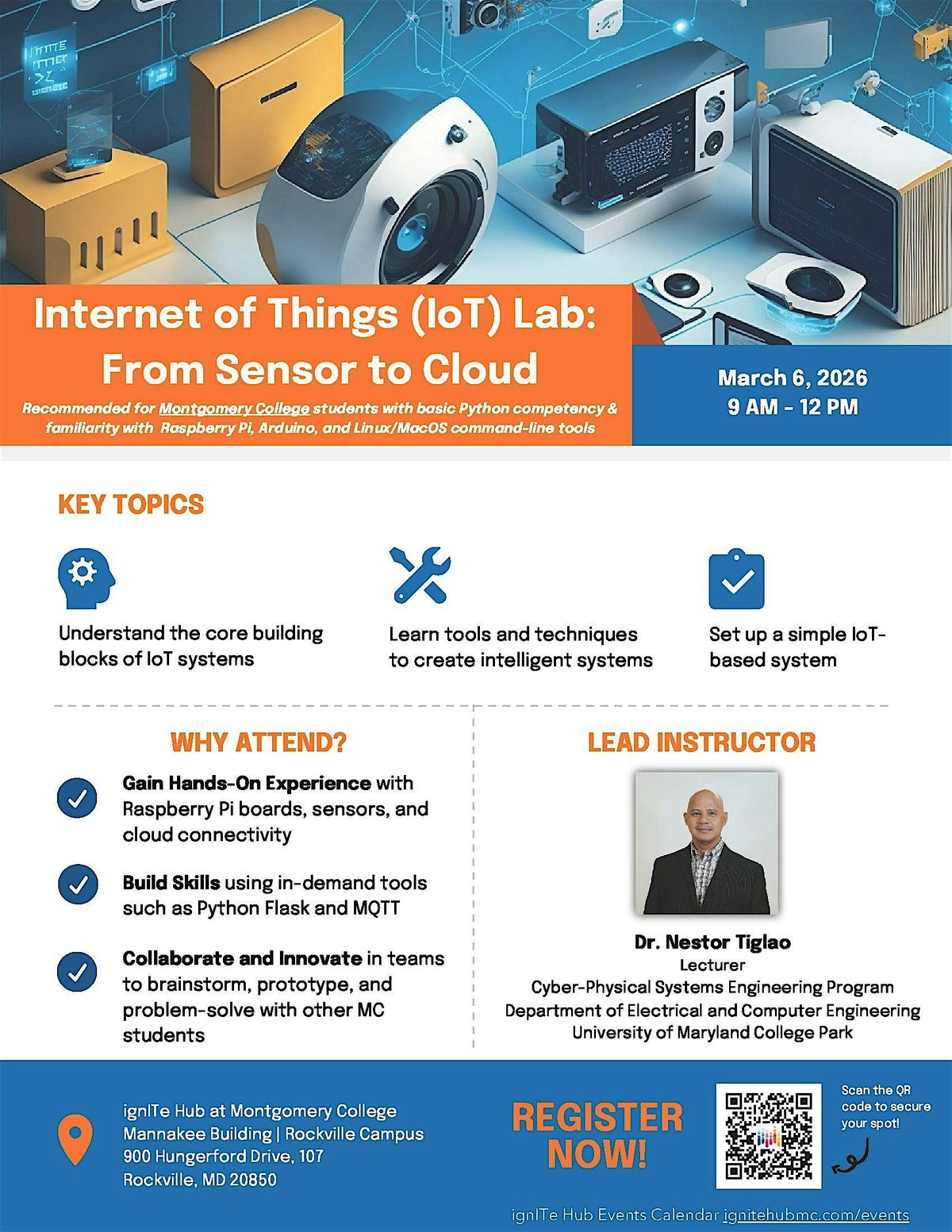 Join us for “Internet of Things (loT) Lab: From Sensor to Cloud,” an exciting, fast-paced, hands-on workshop that introduces Montgomery College students to the fundamentals of the Internet of Things (IoT) and exposes them to tools and techniques for building IoT-based solutions. Participants will learn how smart devices sense, process, and act on real-world data—gaining practical experience in connecting sensors, analyzing data, and building intelligent prototypes.