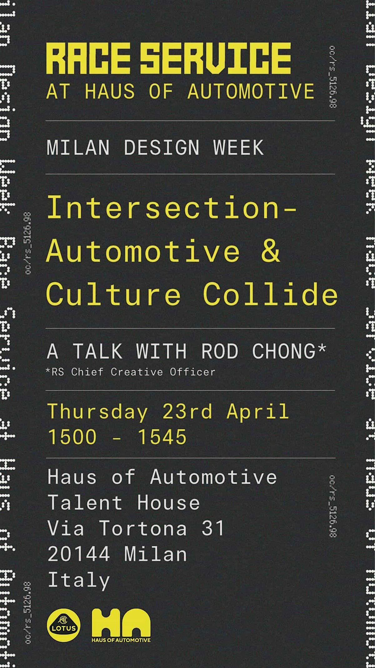 Rod Chong, Chief Creative Officer at Race Service will be speaking at the Lotus “IN PROGRESS” exhibition on April 23rd in Milan.