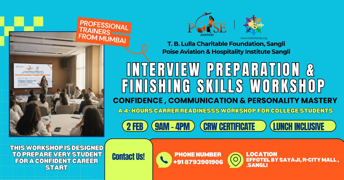In today’s competitive job market, your academic results are only the beginning. To truly stand out, you need to master the art of confidence, communication, and professional presence. Hosted by the T. B. Lulla Charitable Foundation, Sangli and Poise Aviation & Hospitality Institute Sangli, this intensive 4-hour workshop is designed to transform college students and freshers into career-ready professionals.