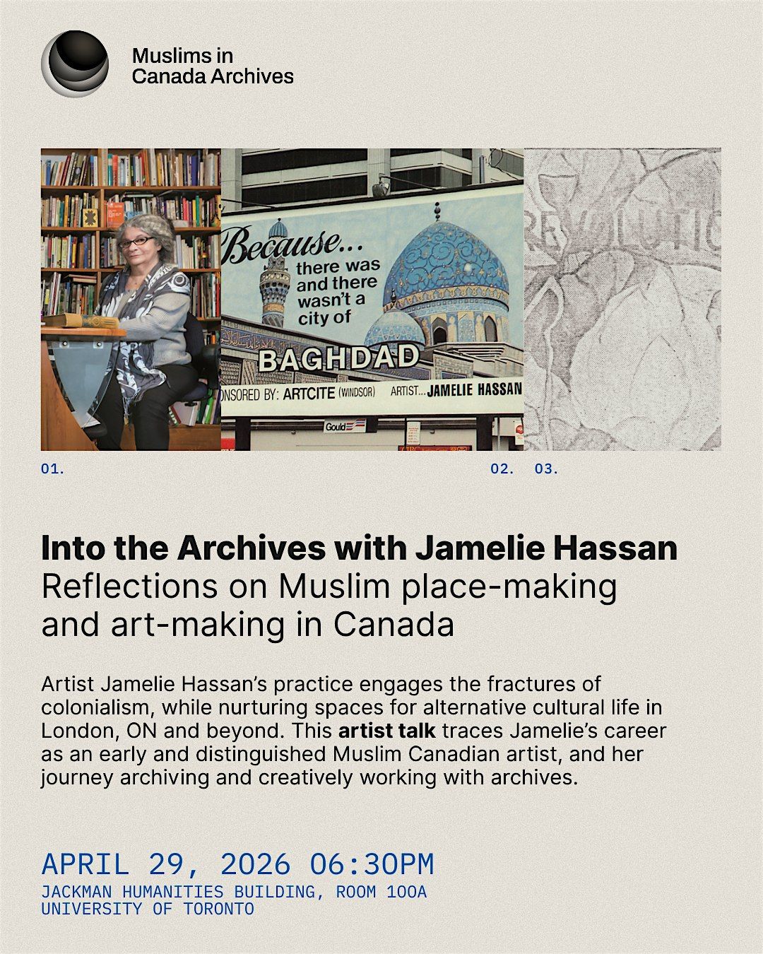Followed by an audience Q&A, this is an evening dedicated to reflections on art-making, place-making and archival collections that enrich our understanding of the past, present, and future of Muslim life in Canada.