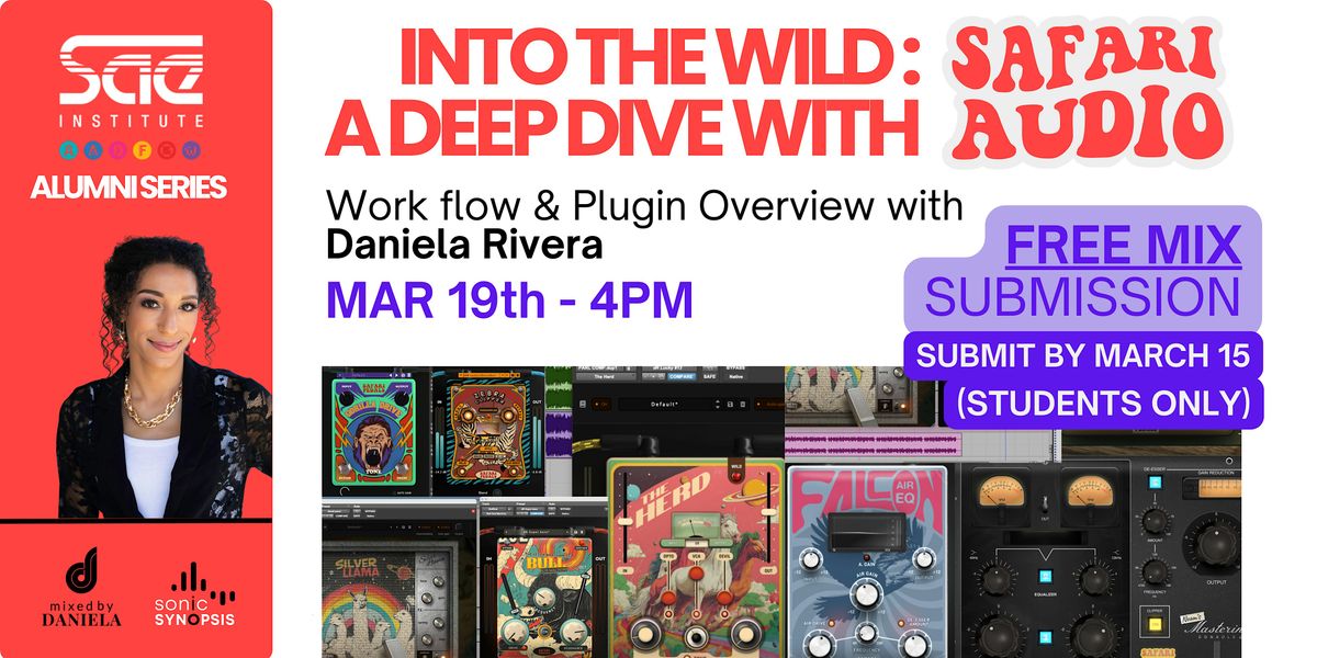 SAE Alumni Series with Daniela Rivera. This in-person event lets you discover sounds like never before, with stunning audio that brings the safari straight to your ears. STUDENTS can submit for a FREE MIX to walkthrough professional workflows and overview of Safari Audio plugins. PLEASE SEE TICKETS OPTIONS & ADD ONS.