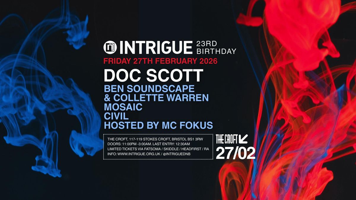 A new year is upon us, and this February we celebrate a massive 23 years of Intrigue!! Showcasing the best in drum & bass in Bristol and beyond. Big love to everyone who’s ever been part of an Intrigue night, whether on the dancefloor or on the stage — we salute you.Headlining our birthday show is one of our favourite DJs, the legendary Doc Scott, with support from residents Ben Soundscape, Collette Warren, Mosaic & Civil. Hosted by MC Fokus, one of our longest running resident MCs who first cut his teeth at Dojo's back in the day. We've selected an intimate, legendary Bristol venue for this special night, the mighty Croft which has played host to many amazing events over the years.