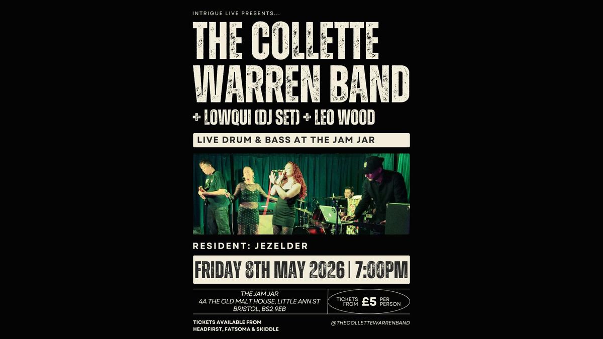 The Collette Warren Band returns for a special show at The Jam Jar in Bristol. Joining them are special guests Lowqui with a DJ set, Leo Wood performing live, and Intrigue resident Jezelder on the decks. Expect a night of live drum & bass, soulful vocals, and heavyweight selections.Get your earlybirds now!!Lineup:▶ The Collette Warren Band▶ Lowqui (DJ set)▶ Leo Wood▶ + resident: JezelderVenue: The Jam Jar, Doors: 7pm-10pmDRUM & BASS SINCE 2003Disclaimer: