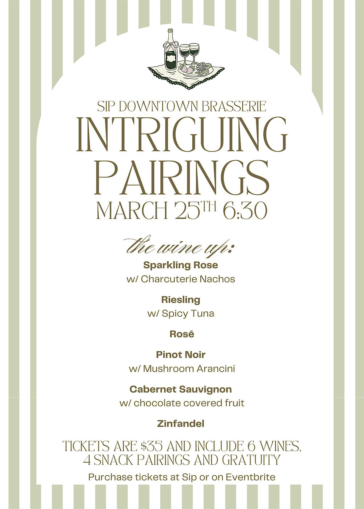 Join us at Sip Downtown Brasserie for a wine tasting that celebrates the joy of the unexpected. We’ll explore six wines, four paired with foods you might not normally think to put with wine—but absolutely should. From salty snacks to savory bites, these surprising combinations highlight how the right pairing can transform both the wine and the food. And of course, we’ll also feature two wines poured for no reason other than the fact that they’re delicious and we felt like it. Come curious, come thirsty, and be ready to discover some new favorite pairings.