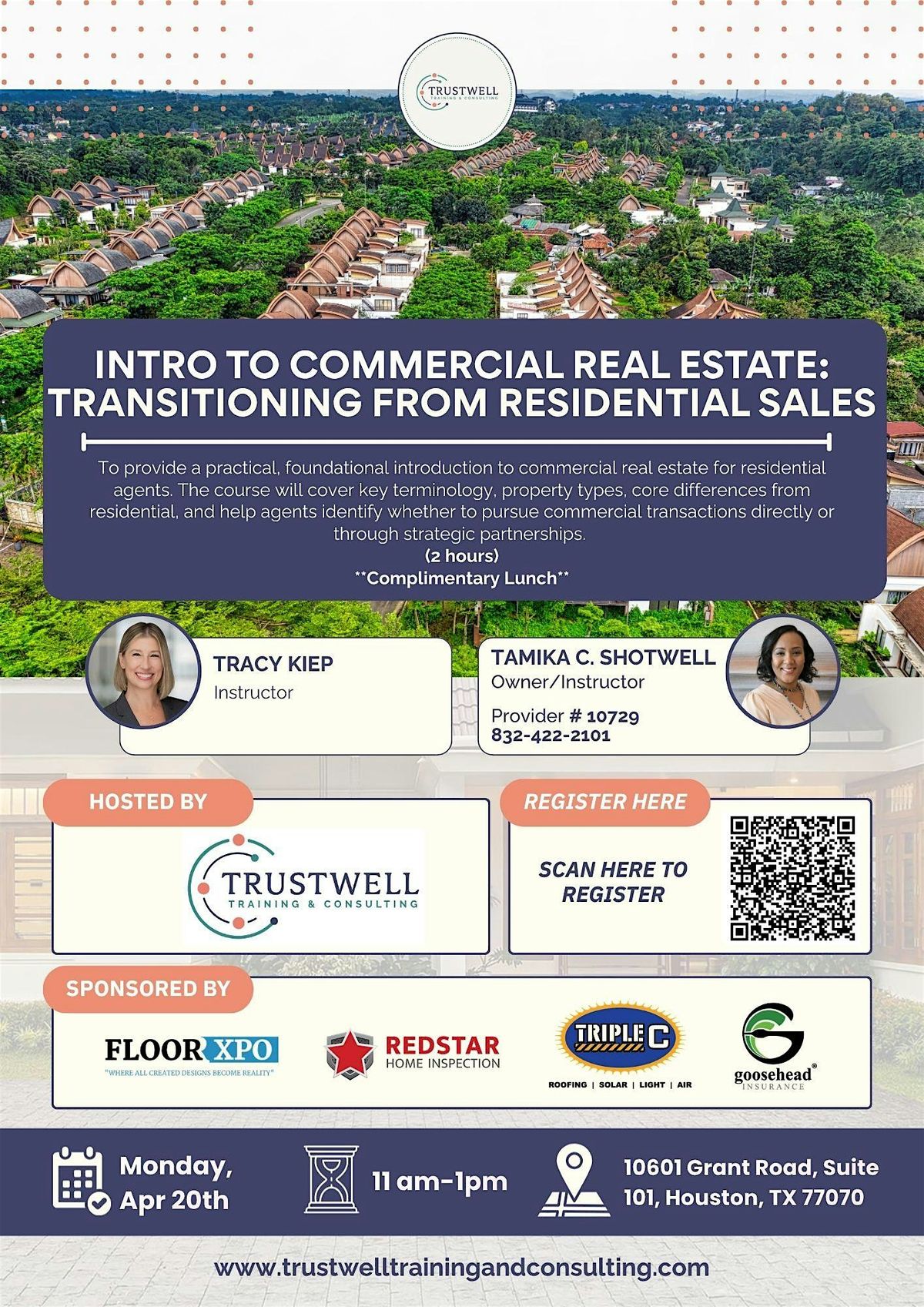 The course will cover key terminology, property types, core differences from residential,& help agents identify whether to pursue commercial