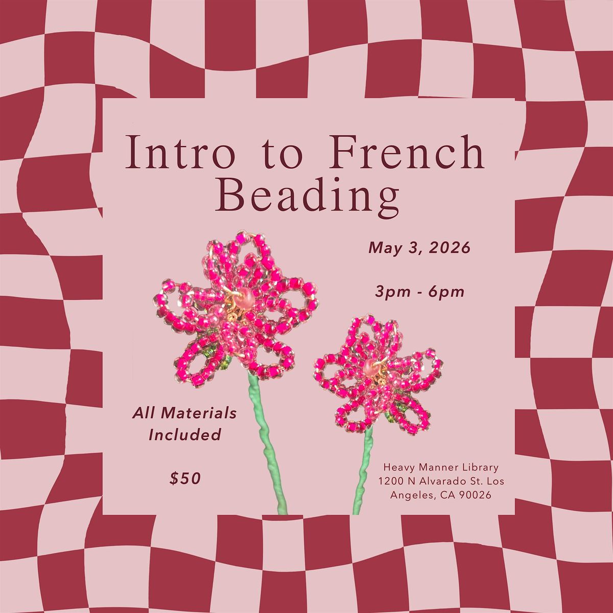 Learn the art of French beading in this beginner-friendly class designed for all ages. Using simple techniques, you’ll create beautiful, delicate beaded flowers while building foundational skills you can keep exploring at home. All materials are provided.