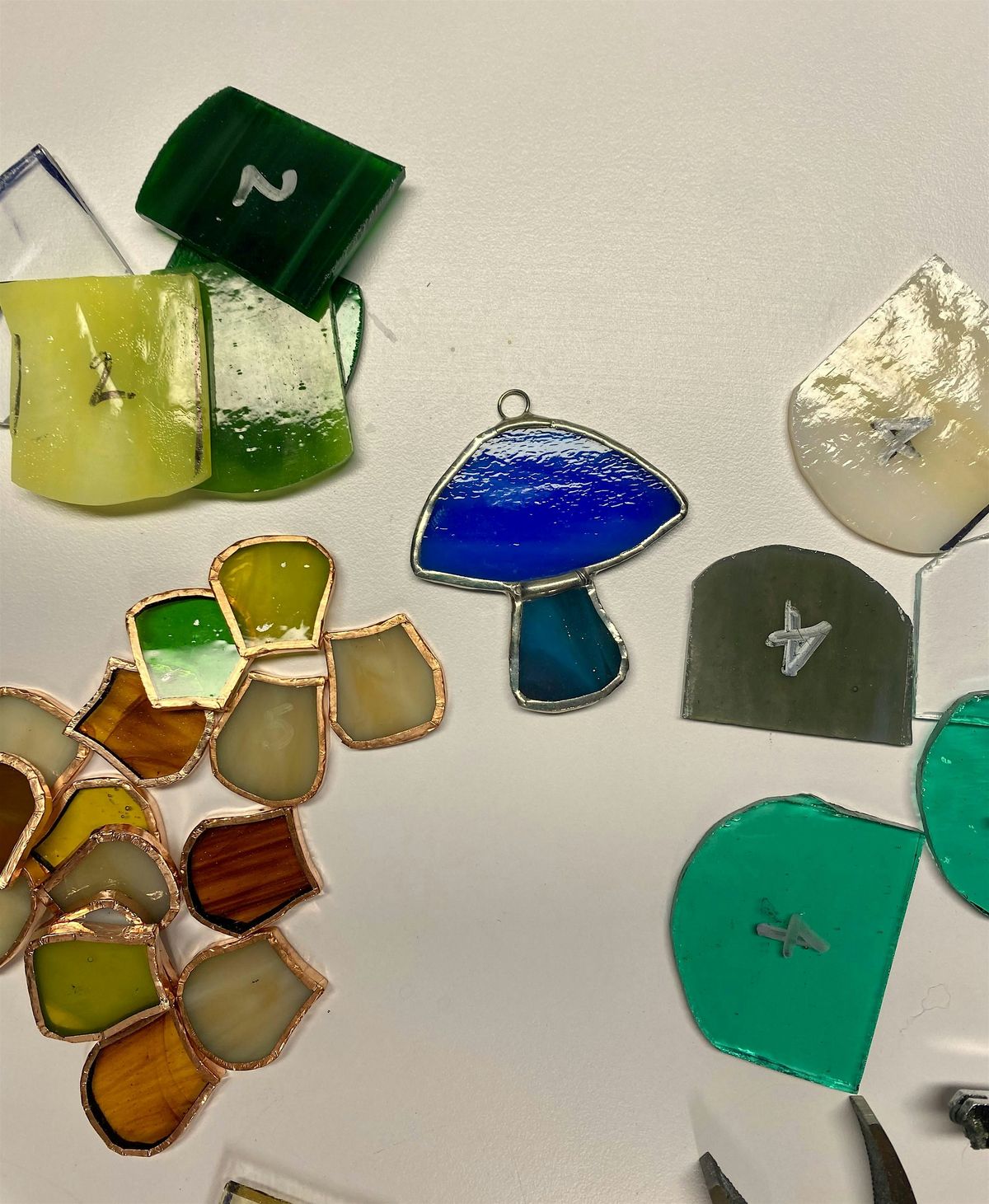 Join us for a 3½ hour, hands-on stained glass workshop. You’ll create TWO finished stained glasss mushroom pieces ready to brighten your windows or add charm to your plants.They will be completely designed and crafted by you from start to finish!