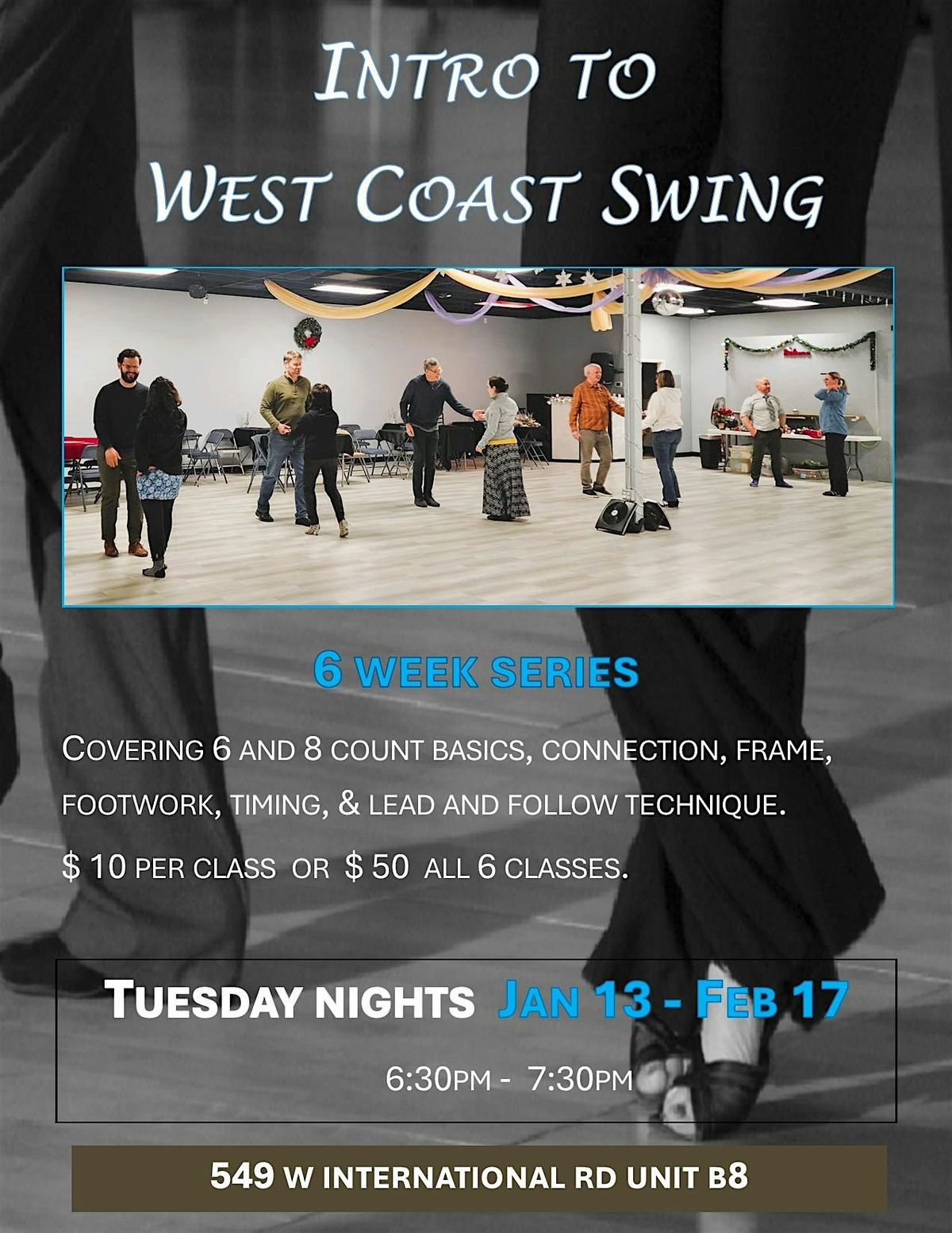 Every Tuesday for 6 weeks. The cost is $ 50 for all 6 lessons paid in advance on on the first night of class. If you know some wcs you can join after the first week. Walk-in cost is $ 10 per 1 hour class per person. You do not need a partner as we rotate in class. Bring indoor non-marking shoes. Dance shoes, or shoes with hard leather soles, or other shoes that allow you to rotate.