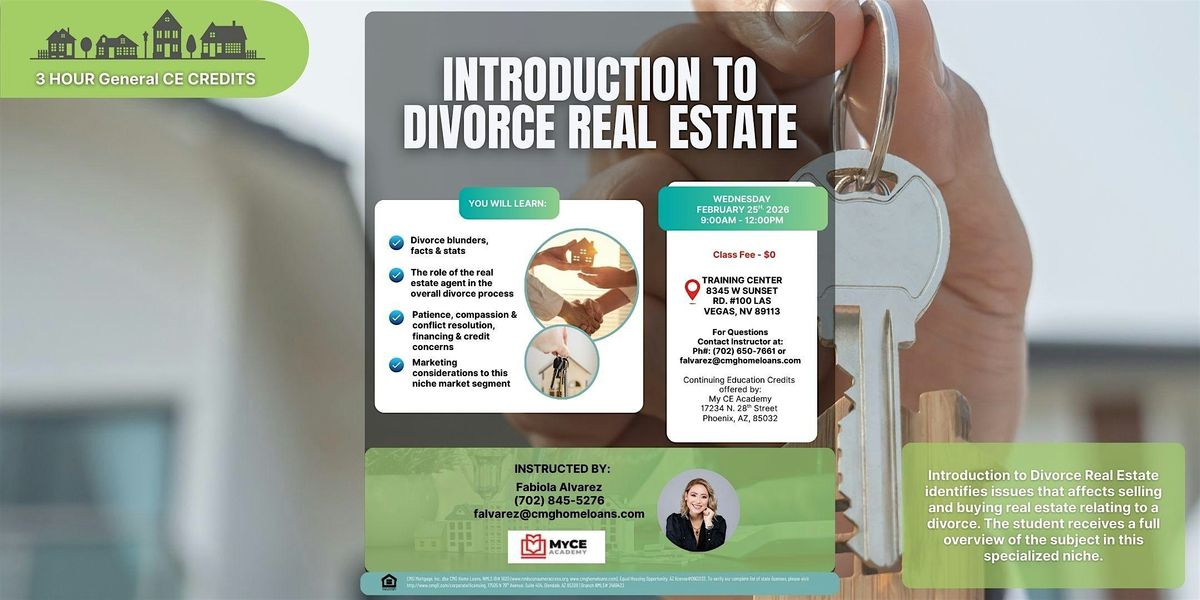 Welcome to the Introduction to Divorce Real Estate event! Join us on February 25, 2026 at 9:00 AM at 8345 W Sunset Rd ste 100 to learn all about navigating real estate during divorce. Whether you're a realtor, lawyer, or just curious about the process, this event is for you! Let's dive into the ins and outs of this unique aspect of real estate. See you there!