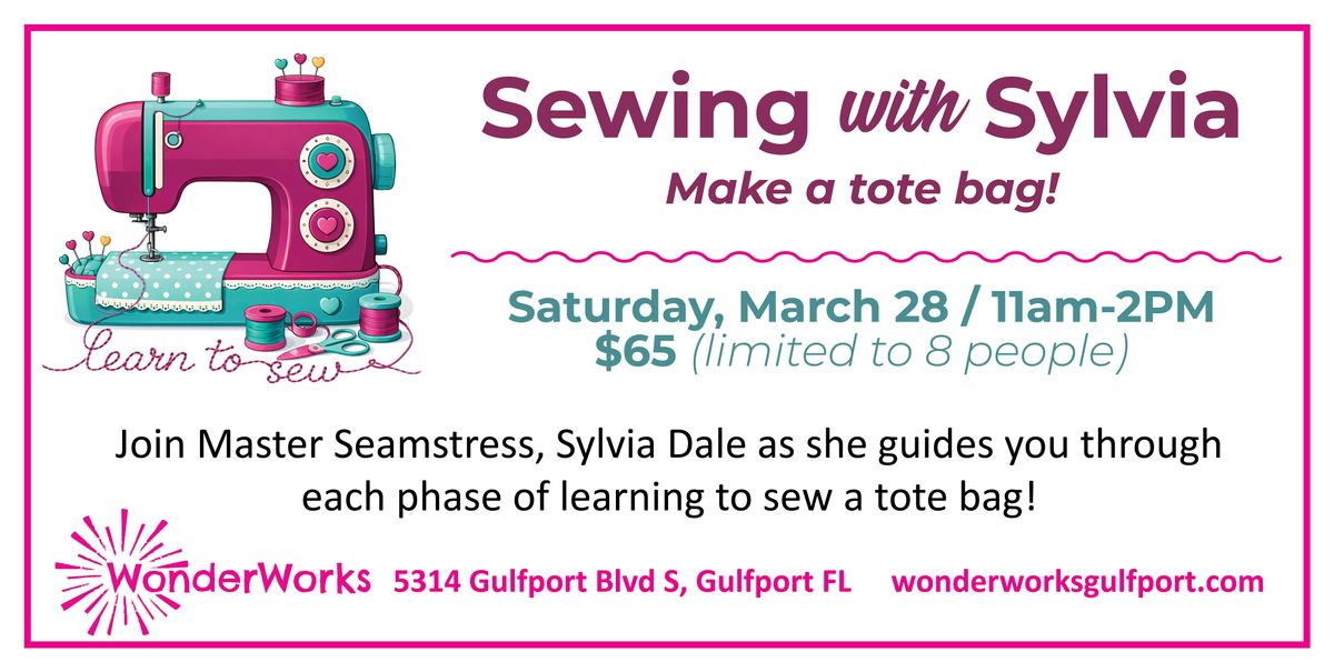 If you've ever wanted to learn to sew on a sewing machine, this is your chance. This introductory workshop will teach you the basics of sewing machine use from loading the bobbin to closing that final stitch. You will be guided through each step by Sylvia Thiemann-Dale of The Sylvia Dale Collection. Each participant will create their own Tote Bag to keep. This will be the first in a series of workshops that will build your knowledge of technique while fostering your own creative style. This class is open to anyone ages 12 and up but kids under 16 must have an adult accompany them. All materials will be provided.