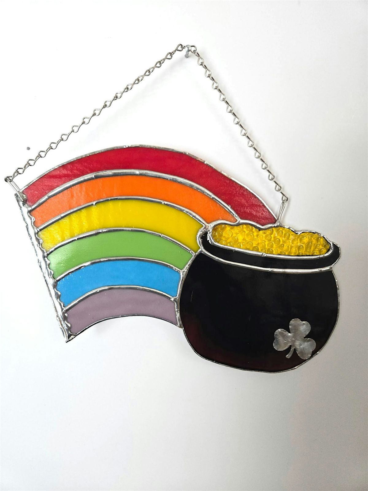 With this workshop you will have a chance to learn about the basics of building stained glass by putting together a Pot of Gold and Rainbow. This class will focus on copper foiling and soldering with no glass cutting. When you arrive your set of glass pieces will be cut and ready for you to begin foiling. You will use specialized tools to solder with very high temperatures.