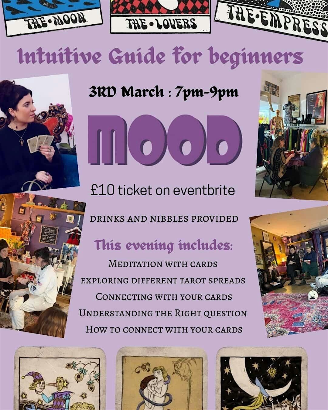 Join us at Mood Hove on March 3, 2026 at 7:00 PM (GMT) for a relaxed and fun introduction to tarot! Whether you're curious or just starting out, this session will help you connect with the cards in a simple, intuitive way. No experience needed—just bring your open mind and good vibes. Come explore the magic of tarot and discover what the cards have to say about you!