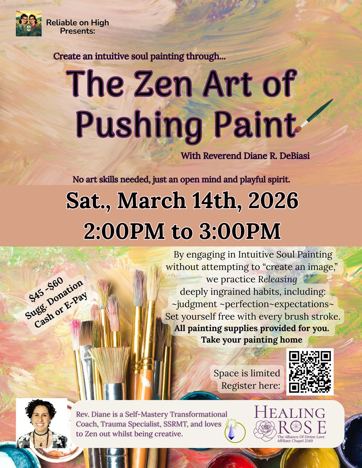 Learn the Zen Art of Pushing Paint with Rev. Diane. Free yourself from judgement, perfectionism, expectation, with every brush stroke.