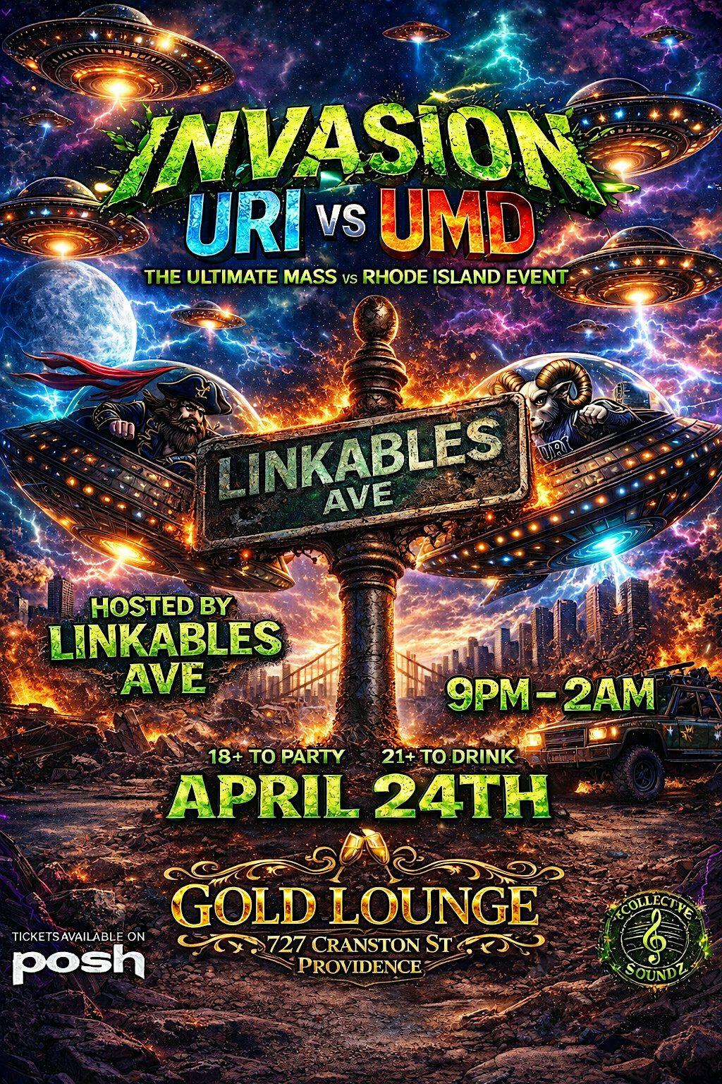 Get ready for INVASION: URI vs UMD at Gold Lounge on Friday, April 24th. This is the ultimate Mass vs Rhode Island link-up, bringing together big energy, competition, and a wild late-night vibe in Providence. Hosted by Linkables Ave, this event is built for everyone looking to step out, rep their side, and be part of one of the craziest parties of the semester.