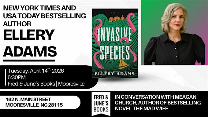 Join Fred & June's Books in Mooresville for a book launch event featuring New York Times and USA Today bestselling author Ellery Adams as she talks about her newest novel, Invasive Species. Ellery will be in-conversation with Meagan Church, bestselling author of The Mad Wife. Your event ticket includes admission to the event and a hand-signed hardcover copy of Invasive Species.