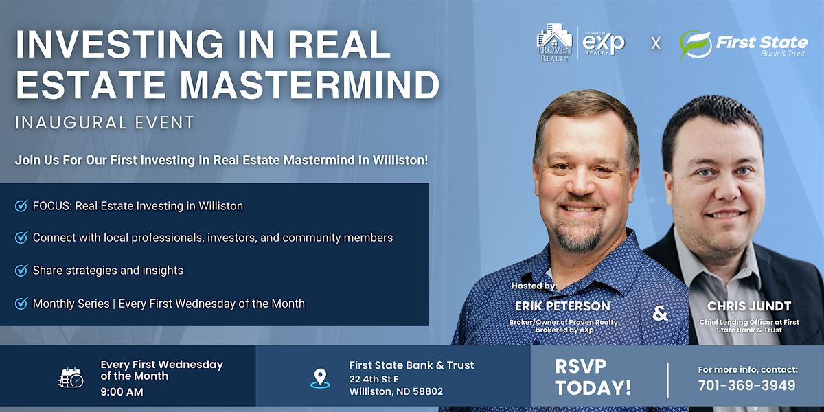 Hosted by Proven Realty and First State Bank & Trust, this monthly mastermind connects investors, lenders, and real estate professionals in Western North Dakota.