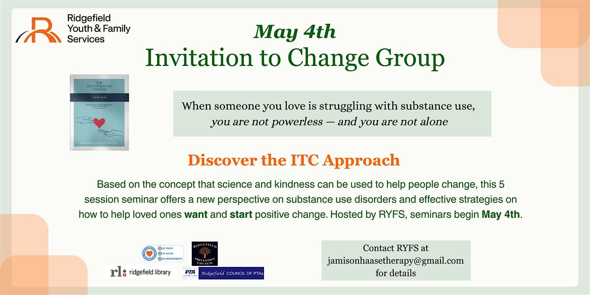 Hosted by Ridgefield Youth and Family Services, seminars begin May 4th at 6:30-8 pm at the Ridgefield Library. Please contact RYFS at [email protected] for details.