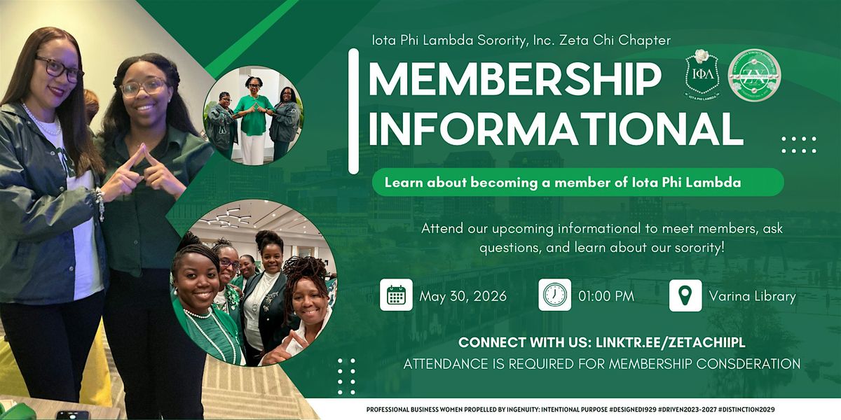 Join the Zeta Chi Chapter of Iota Phi Lambda Sorority, Inc. for our upcoming interest meeting! Enjoy our presentation, where you will learn about our organization and what it means to be a chapter member. This relaxed and informative event is the perfect opportunity to meet chapter members and get all your questions about joining Iota answered.