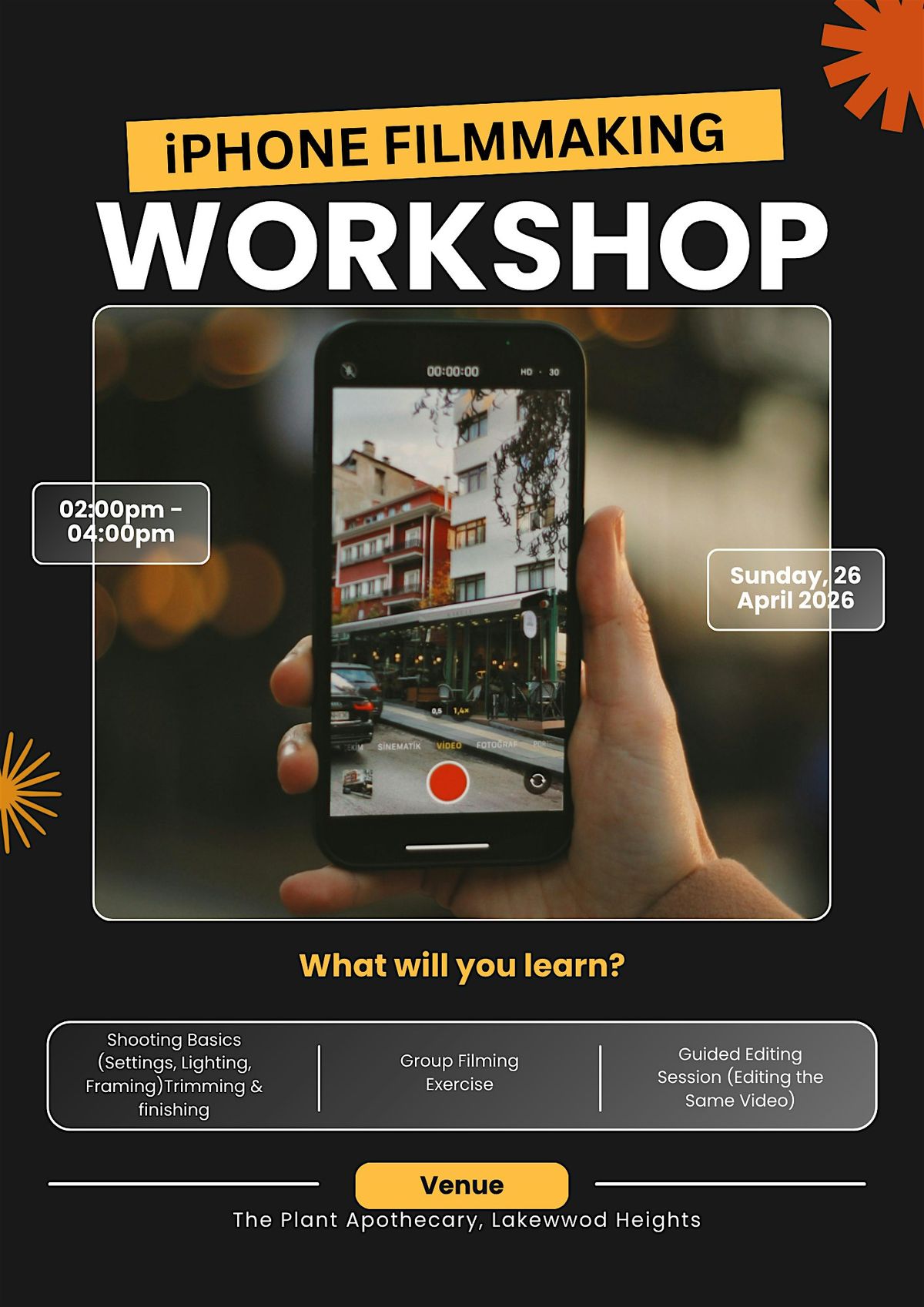 Participants will dive into the fundamentals of iPhone filmmaking. In two hours, they’ll learn how to shoot professional-looking video using the device they already have. We’ll cover camera settings for cinematic quality, essential lighting techniques, smooth handheld shooting, and editing apps to polish their final product. Whether they’re creating reels, mini-docs, or branded content, they’ll leave ready to tell compelling stories straight from their phone.