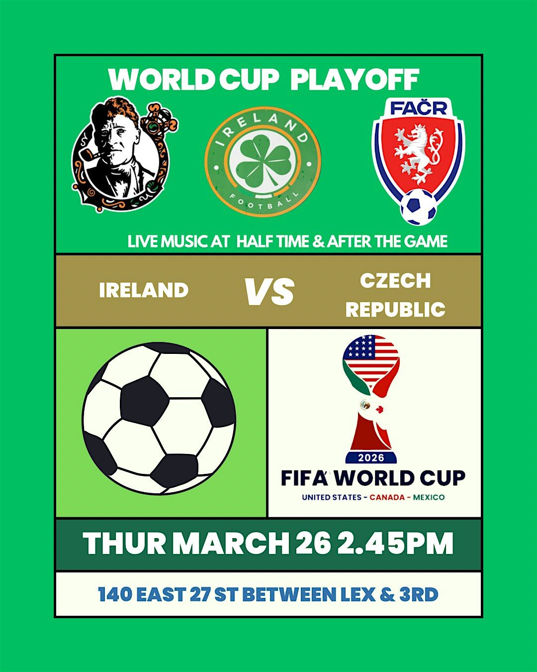 Experience the thrill in person as Ireland takes on Czech in this epic World Cup qualifying match. Live music before , after and at half time !